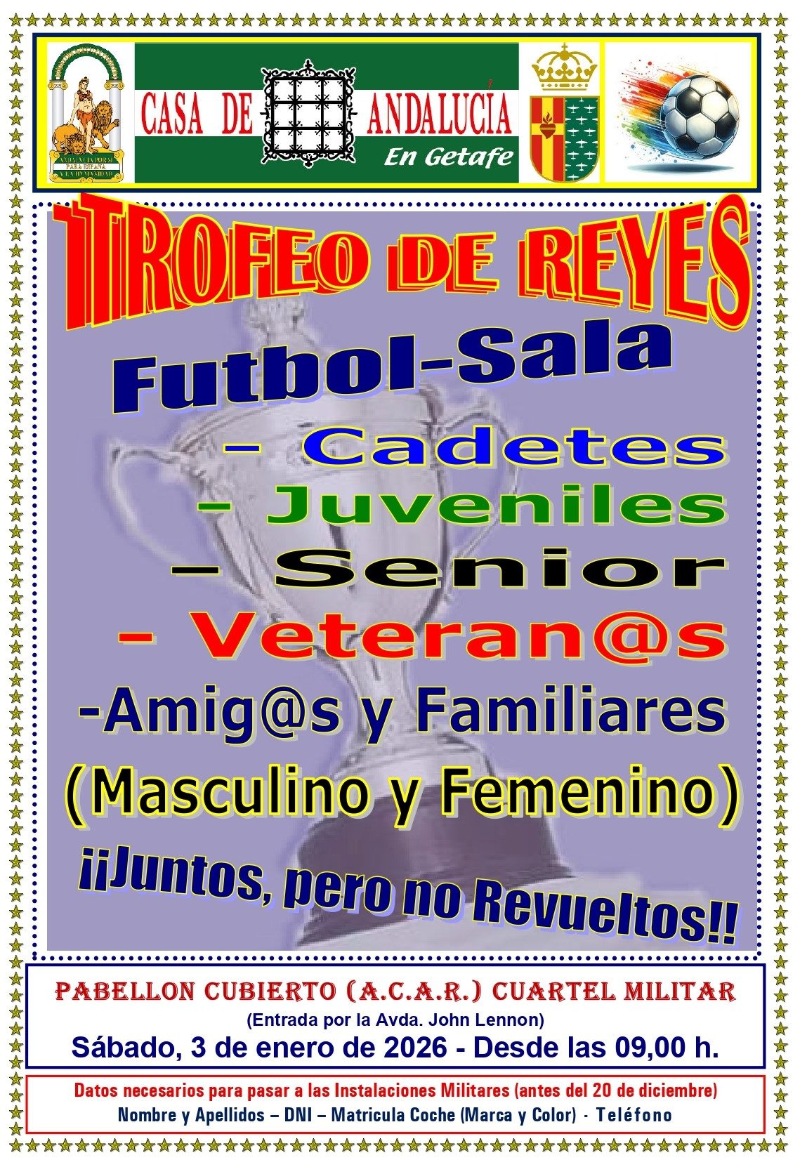 Sábado 4 de enero de 2025. Pabellón del A.C.A.R. - Trofeo de Reyes de Futbol Sala, jugado entre niñ@s, jóvenes, mayores y veteren@s de nuestra Casa, acompañados por un grupo de ANIMADORAS, que después ya en nuestra Casa siguieron animando con bailes navideños.